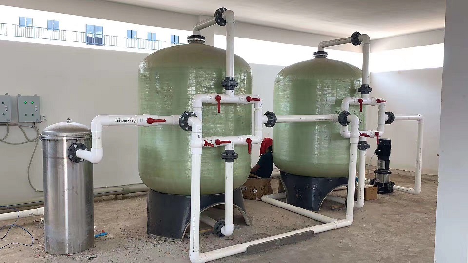 地下水、水庫水中含有多種雜質(zhì),如懸浮物、膠體、重金屬、有機物、鐵銹和無機鹽等,為保證水質(zhì)達標,則必須先去除水中的懸浮物、膠體、有機物等,使反滲透的進水達到要求,故本系統(tǒng)設(shè)置多介質(zhì)過濾器+活性炭過濾器+軟化器+殺菌作為原水處理系統(tǒng)。本處理系統(tǒng)包括原水箱、原水增壓泵、多介質(zhì)過濾器、活性炭過濾器、離子交換軟水器、殺菌設(shè)備、凈化水水箱及反洗系統(tǒng)。